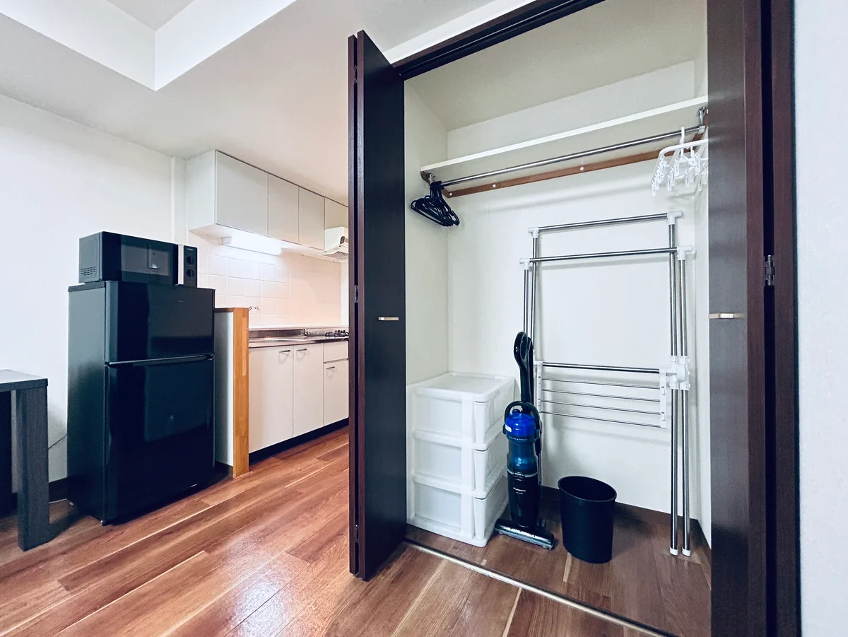 延長コード、ヤカン、トイレットペーパー、シャワー、ゴミ箱、ハンガー、室内物干し、衣装ケース、ピンチハンガー